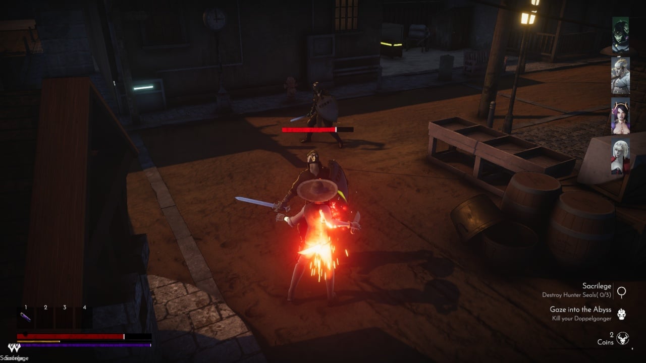 В Monstrous делается упор на ближний бой. Поединки немного напоминают Dark Souls. Боевка тут полностью нон-таргетовая. То есть, противника брать в цель не нужно. Враги тут представлены местными горожанами. Они держат в руках булавы или мечи, а также щиты.