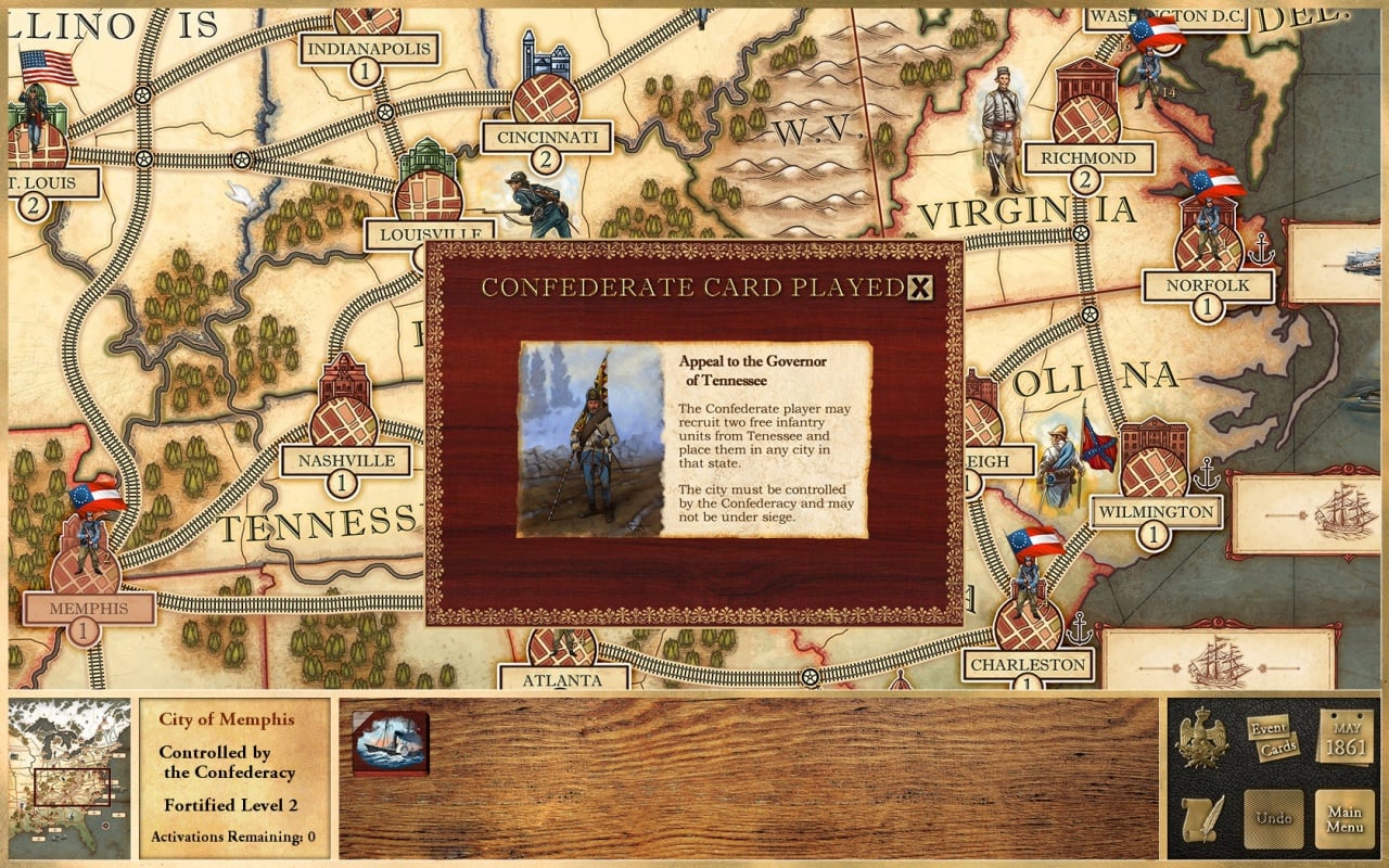 - Следуйте сражениям за Союз или Конфедерацию в 1861 году. Либо примите участие в альтернативных сценариях, где сюжет повернется не как в истории.