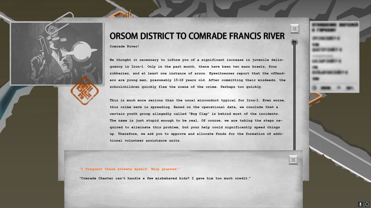 Вы будете управлять городом под названием Железный-1. Вокруг царит тоталитарный режим и держава переживает последствия затяжной революции, после которой последовал дефолт и экономический кризис. Однако юная кровь способна привести страну к светлому будущему и протагонист - один из таких людей. Славься, Содружество Народных Оранжевых Коммун и товарищ Стилл!