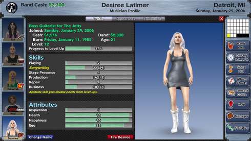 Нанимайте сессионных музыкантов, выстраивайте отношения с участниками в группе или менеджерами, зарабатывайте репутацию трудоголика, чтобы привлекать новых инвесторов и продюсеров. Изучайте интересы публики, следите за их реакцией и пишите идеальные песни, которые смогут заинтересовать тысячи слушателей. Отправляйтесь в тур по всем Соединенным Штатам, чтобы заявить о себе.