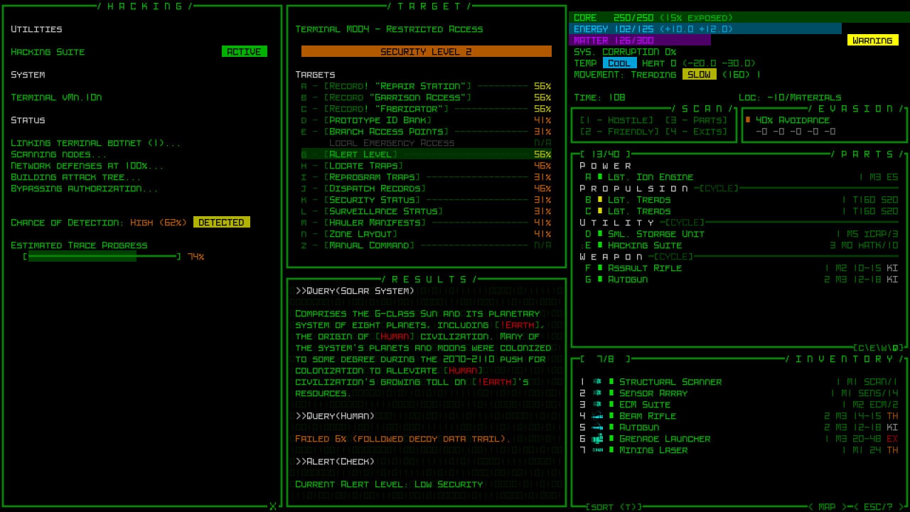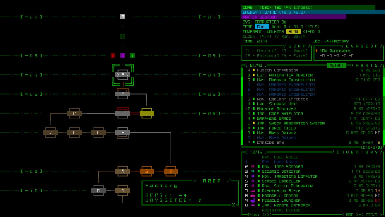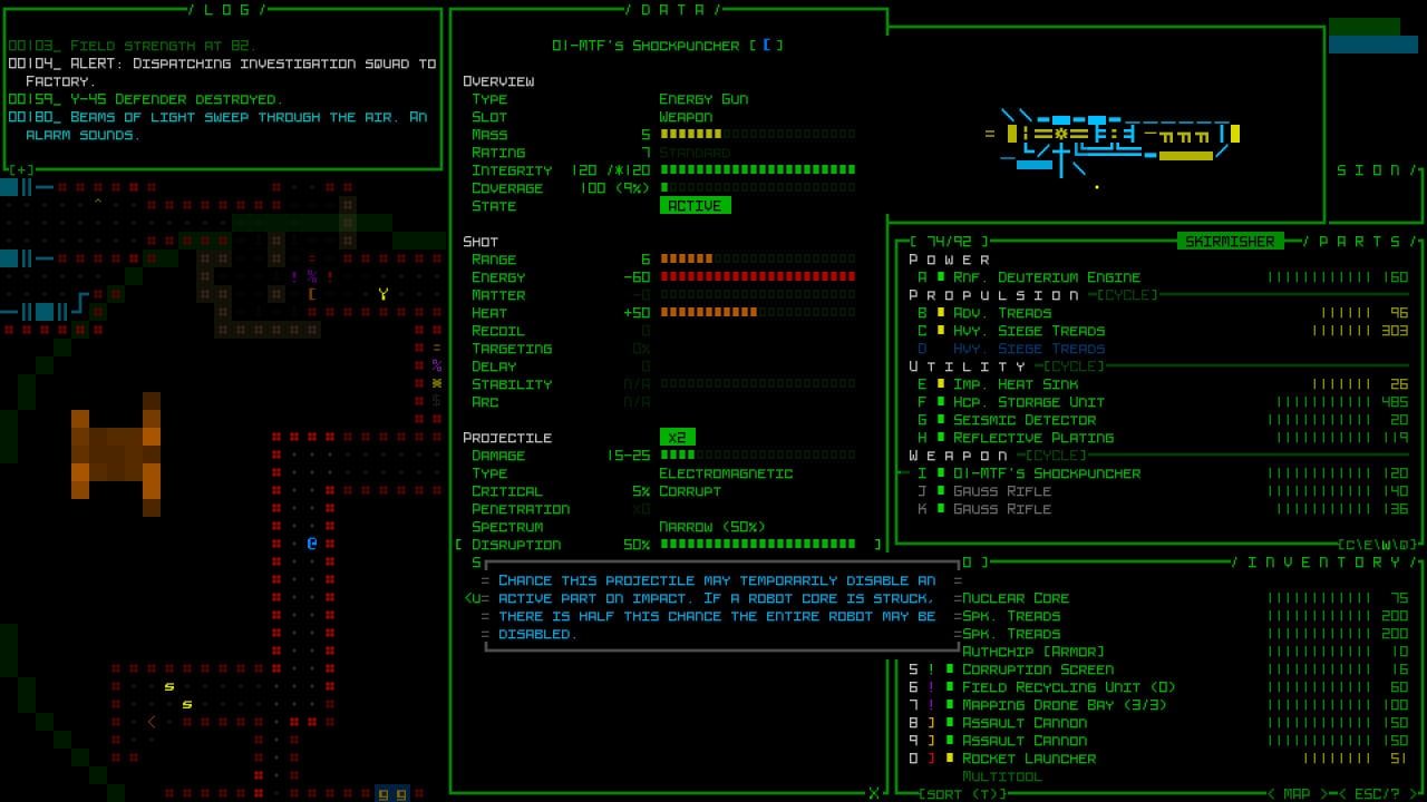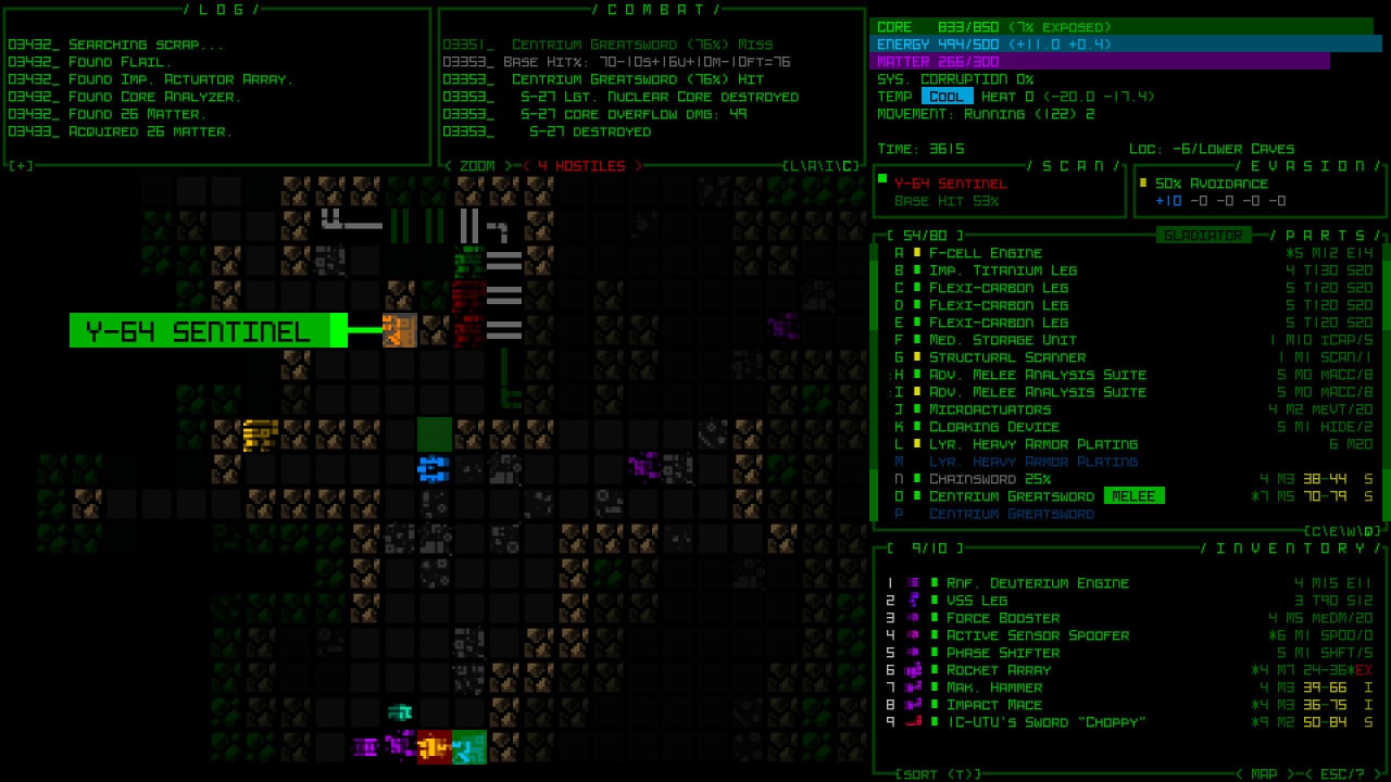 Cogmind - научно-фантастический рогалик, в котором вы будете играть за робота, собранного из компонентов других машин. Боевка Cogmind представлена пошаговой стилистикой. Вы можете исследовать большой мир, взламывать устройства, тихо пробираться в стратегически важные места или же действовать напрямую и атаковать противников прямо в лоб. Игровой процесс не ограничивает вас действиями. Играйте так, как хотите того сами.