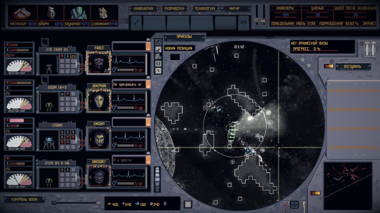 Меню ангара состоит из трех основных пунктов: календарь, пилоты и карта. Последняя показывает глобальное положение дел и распределение сил во всем мире. Пилоты - отряд элитных бойцов, управляющие техникой, а календарь показывает все события, которые ожидают в будущем, плюс ведется учет совершенных ходов и состоявшихся поединков.