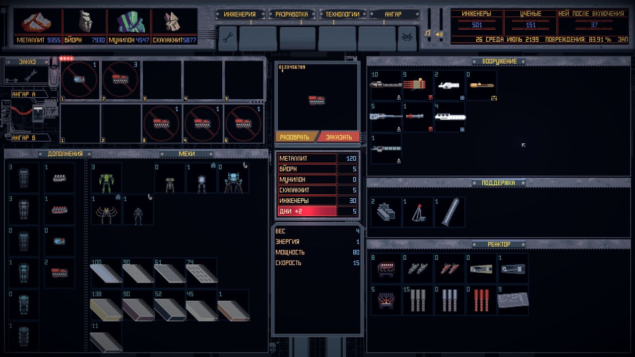 Механики игры состоят из: Активации реактора, Настройки оружия, Сборки, Покупки компонентов и Исследования. Самыми важными показателями для бойцов являются REACTION и C.B.S. TEST. Вы можете отправить на задания только тех роботов, у которых есть пилоты. RESEARCH позволяет изучить новые технологии. Кнопка INGNITE позволяет привести меху в действие после того, как все компоненты были установлены правильно.