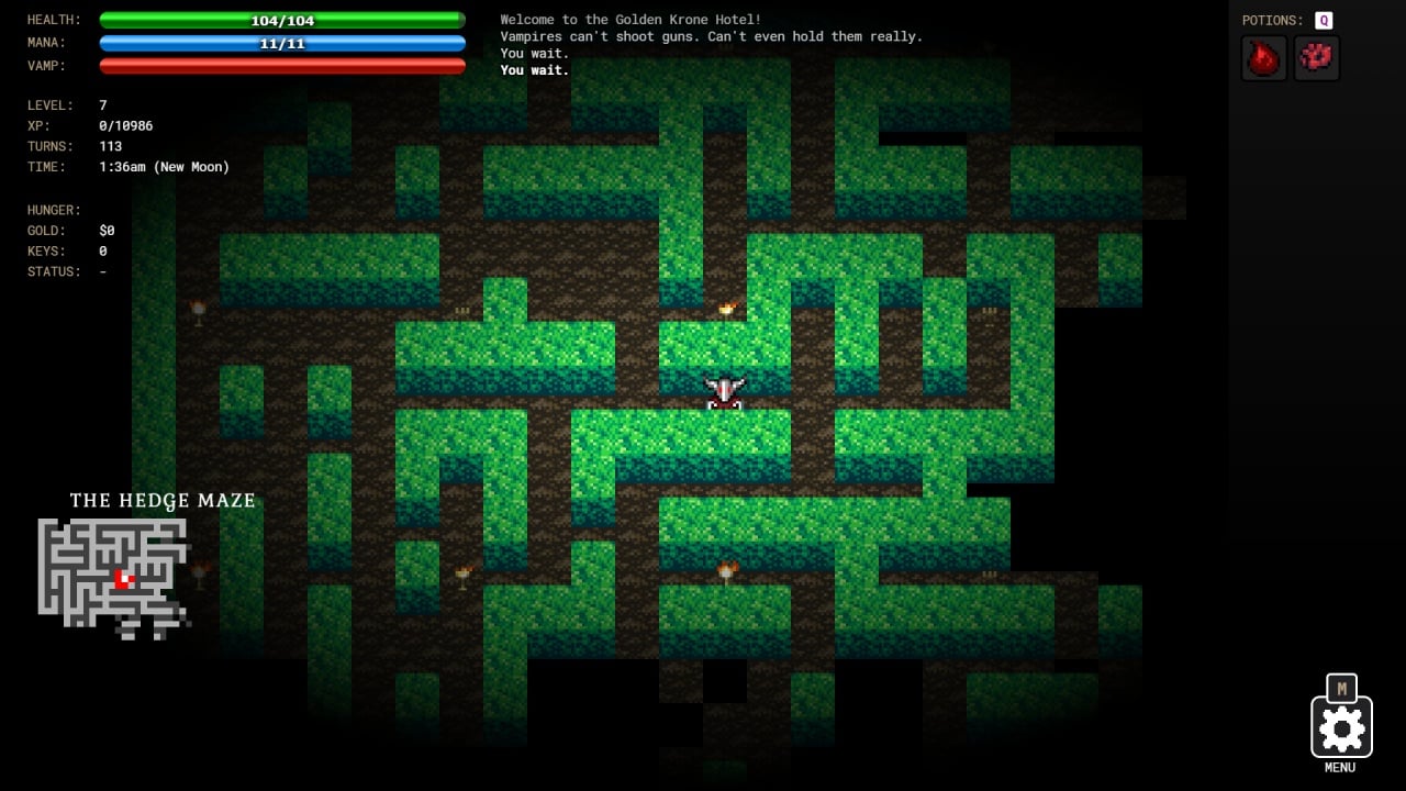 Golden Krone Hotel – ролевое хоррор-приключение с пиксельной графикой, камерой сверху, пошаговыми поединками, и элементами из жанра рогалика. Сеттингом проекта, разработанного инди-студией, становится готический фентезийный стиль. В мир игры идеально вплетены вампиры и связанные с ними механики. Для преодоления агрессивно настроенных кровопийц, геймер может использовать свет. Также, предусмотрена возможность самолично стать кровососом, что повлечёт изменение в скиллах и механике столкновений с недругами. Игрок, которому доступно управление с помощью контроллера, поощряется наградами из списка достижений за определённые успехи в процессе прохождения.